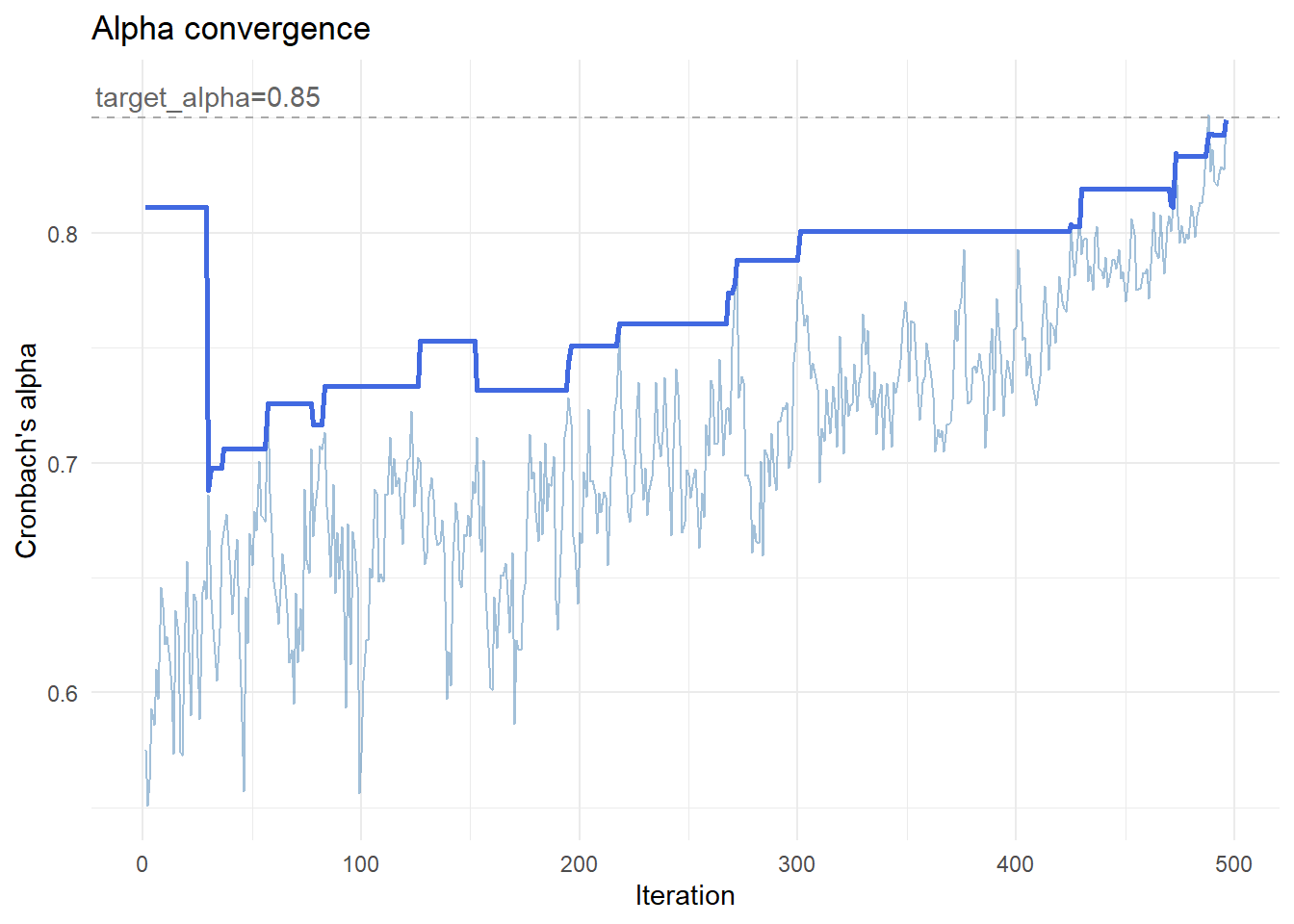This is not a straightforward task. Many different combinations of item values can produce the same total score, but only a small subset will yield the required reliability. The makeItemsScale() function addresses this problem by generating candidate datasets and iteratively refining them to match a target alpha while preserving the original scale values.