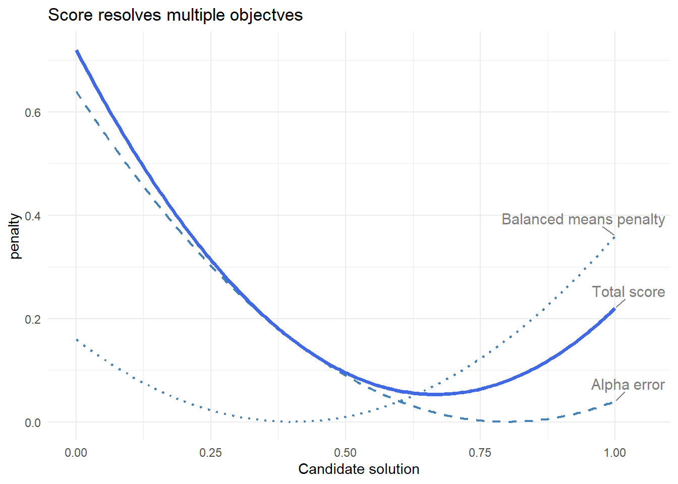 In Figure 1, the horizontal axis (“candidate solution”) represents a range of possible datasets that the algorithm might consider. Each point corresponds to a different arrangement of item values, with varying levels of reliability and balance. The vertical axis shows the penalty assigned by each component of the score function.