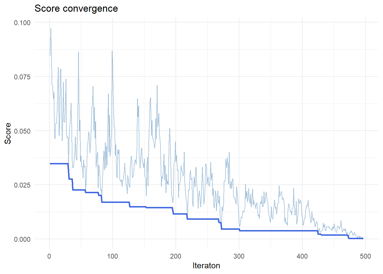 The lighter line shows the current value for score at each iteration. The heavy line shows the best value achieved so far, improving steadily over time.